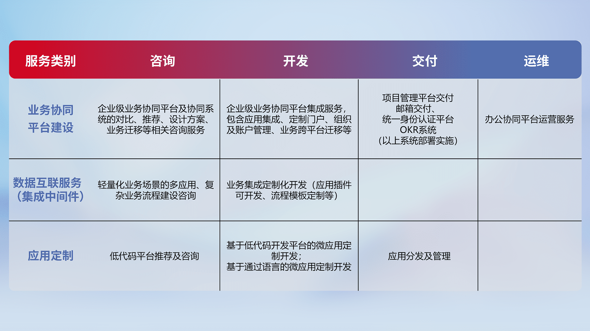 针对钉钉、、、企微、、IDaas等平台级产品提供产品的规划、、、方案、、、交付、、定制化开发等服务,,实现如统一协同办公、、智能客户服务、、混合会议管理、、、、智能数据查询、、、等业务场景,,,,实现数字化转型。。。